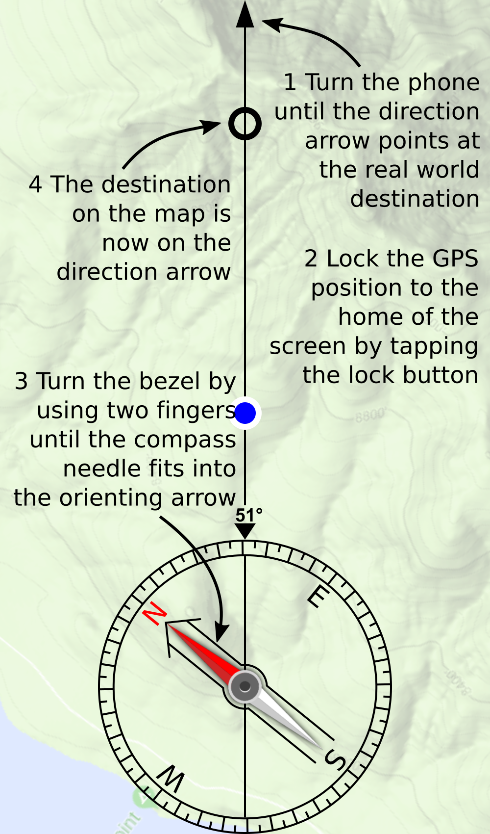 Simpler: Let the map be in the rotation mode and lock the GPS position to a home position of the screen. Turn the phone until the destination on the map is on the direction arrow line. The direction arrow then points to the destination in the real world.